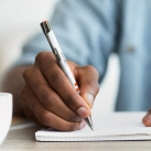 Retractable aluminium ballpoint pen with a painted gloss white barrel, shiny chrome accents and a coloured silicone grip with matching end cap. It has a large volume refill with 1200 metres of black German manufactured Dokumental ink. Panama can be presented in an optional pen sleeve.