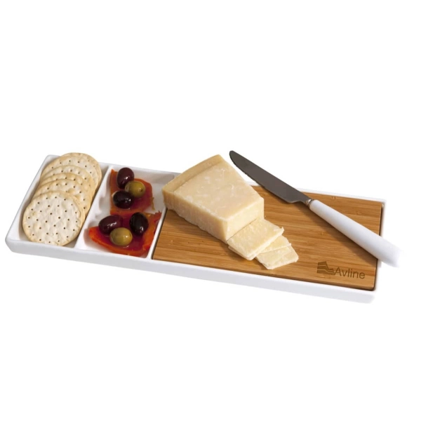 Party Plate combines stylish ceramic with environmentally friendly bamboo. Used around the office and at home this cheese board is the ideal product to feature your logo. Cheese knife included. Because of the unique nature of bamboo, the product and engraving colour may vary from item to item. As this product is hand crafted, each Cheese Board may differ slightly in shape and size.