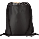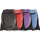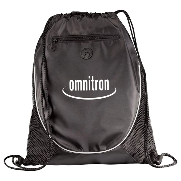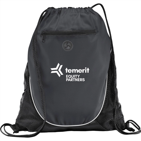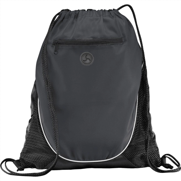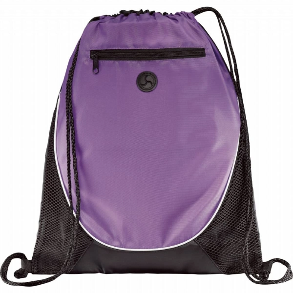 Open main compartment with drawstring rope closure. Zippered front pocket with earbud port. Earbuds not included.