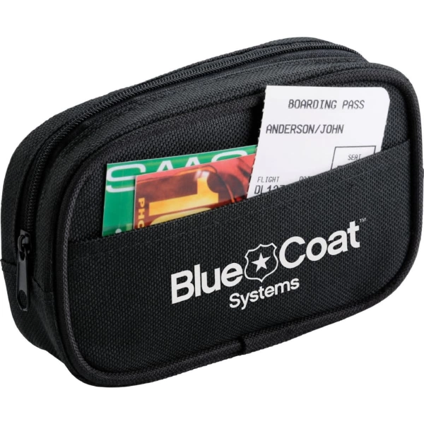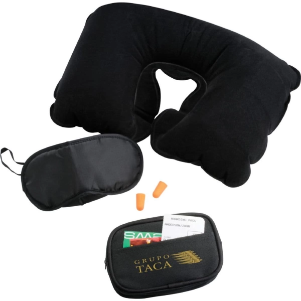 Zippered pouch with open-top front pocket. Includes 2 soft foam earplugs, black eye mask and inflatable soft-touch neck pillow.