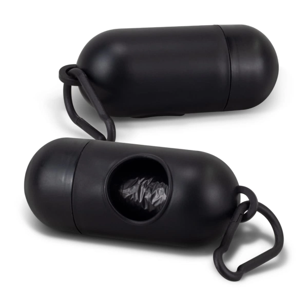 Handy pet waste bag dispenser made from polypropylene with a useful clip for attaching to bags, collars and leads. The dispenser features a pop-open lid and includes 15 waste bags made from polyethylene.