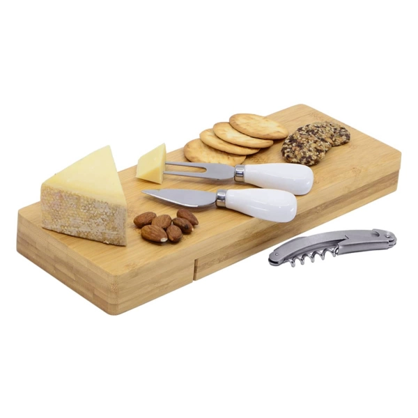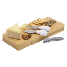 This natural bamboo cheese board set is the ideal addition to any picnic or outdoor event. It features a swivel lid which cleverly conceals a cheese knife, cheese fork and stainless steel corkscrew within the base of the board. This quality cheese set is supplied laser engraved with your logo and packed in a natural coloured gift box, making it the ideal cost-effective gift. Because of the unique nature of bamboo, the product and engraving colour may vary from item to item. As this product is hand crafted, each Picnic Cheese Set may differ slightly in shape and size.