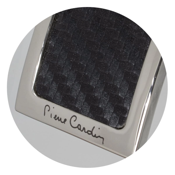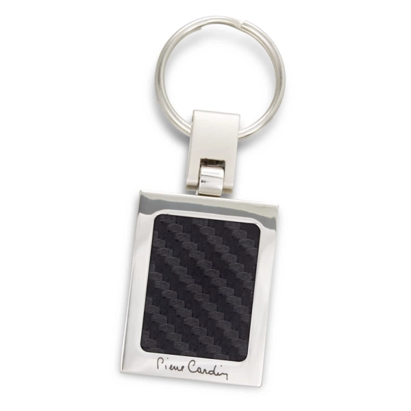 Classic metal key ring from Pierre Cardin. It has a shiny chrome finish and a PU patterned insert which is designed for subtle branding. The Pierre Cardin logo is tastefully engraved on the key ring and it is presented in a black gift box.