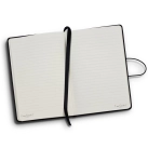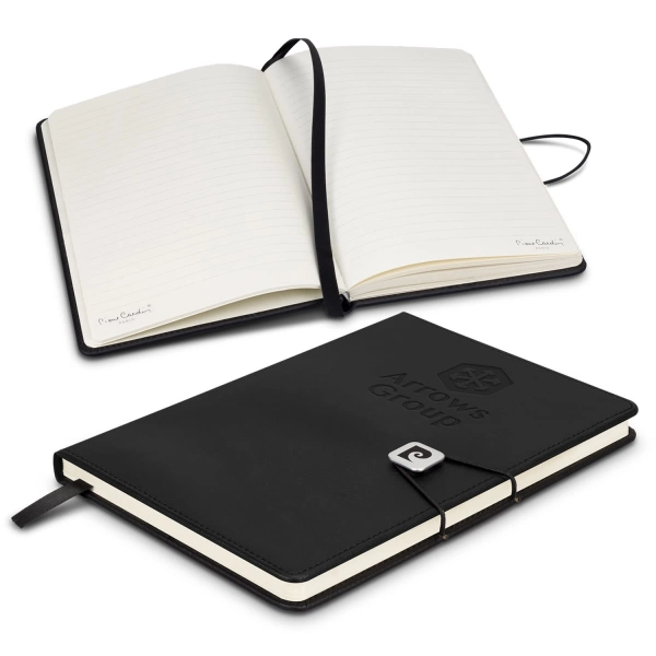 Quality medium-size (approximately A5) notebook that has 80 leaves of cream lined 80gsm paper with a thermo PU cover and a branded metal buckle. The Pierre Cardin logo is debossed on the back cover of the notebook.