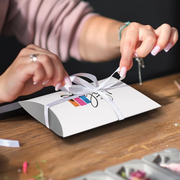 This medium sized pillow box is ideal for gifting or presenting small to medium items and boosting brand recognition. It includes a finger grip for easy opening and pre-creased edges for simple assembly. The long, flat panels provide ample space for branding with a CMYK digital print process. Supplied flat for convenient postage and storage.