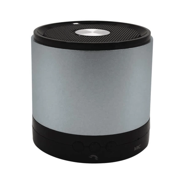 Bluetooth speaker with contrasting aluminium alloy case, auxiliary line input to allows access to smartphones, PC and notebook, built-in 400 mAh Lithium-ion battery, hands-free function, LED power and charge indicators. TF card reader (optional extra cost). Includes 3.5 mm audio cable, USB charge cable and user manual. Material: Aluminium, ABS