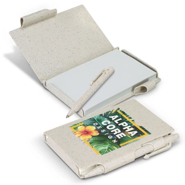 Pocket-size (approximately A6) notebook in a compact case made from a blend of natural wheat straw fibre and ABS plastic. The notebook includes a pen that locks the case closed when in the pen holder, and features a pad with 80 leaves of unlined paper.