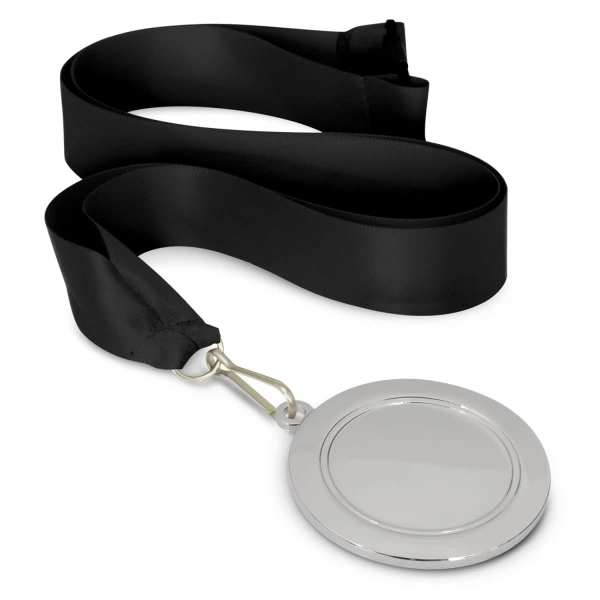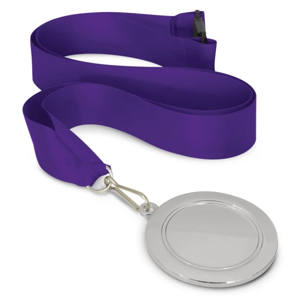 65mm diameter medal which is available in gold, silver and bronze. It can be ordered in one colour or a combination of colours at no extra cost. The medals are branded with the choice of laser engraving or a full colour resin coated finish on the front and laser engraving on the back. Each medal is supplied with a ribbon lanyard which has a safety clip and can be branded in one colour on one side. The medals laser engrave to a natural etch.