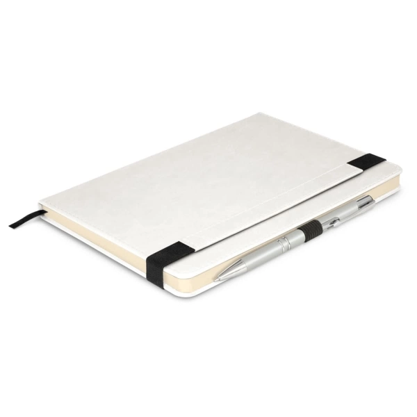 Superb medium-size (approximately A5) notebook with 80 leaves(160 pages) of 80gsm lined cream paper and a hard cover with an antique PU finish. It has a bookmark ribbon and an elastic closure band with a unique branding strip. Premier has a cardboard storage envelope on the inside back cover, and the front cover thermo debosses to a stunning two-tone finish. Each notebook has its own stylish aluminium pen neatly included in the elastic pen loop. The pen and notebook are matched as close as the materials allow.