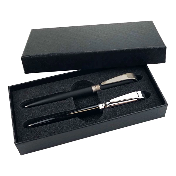 This refined gift set pairs the I-ROQ Ball Pen with the I-ROQ Soft Touch Ball Pen, offering a sleek contrast between a polished silver metal finish and a smooth brass soft-touch surface. Both pens showcase premium European design and are equipped with high-quality Parker-Type Silktech German ink refills, known for their smooth writing and long-lasting performance. Presented in a sleek hard black cardboard gift box with a custom foam insert, this set is perfect for elevating your brand through sophisticated corporate gifting.