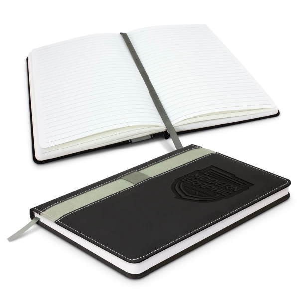 Luxury medium-size (approximately A5), hard cover notebook with a stitched PU cover that features a unique accent stripe which includes an elastic pen holder. It has 80 leaves (160 pages) of 70gsm lined white paper and a bookmark ribbon. An optional paper belly band is available on request and can be branded in full colour.