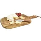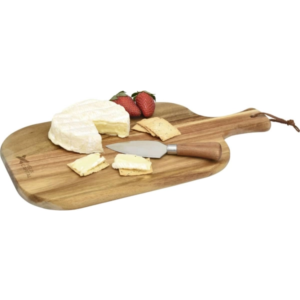 This ‘top of the range’ cheese set is crafted from solid Acacia wood. Featuring a handy cheese knife, leather hang strap and supplied in a stylish form fitting protective gift box, Provence makes the ideal upmarket corporate gift. Because of the unique nature of natural timber, the product and engraving colour may vary from item to item. As this product is hand crafted, each Cheese Board may differ slightly in shape and size.