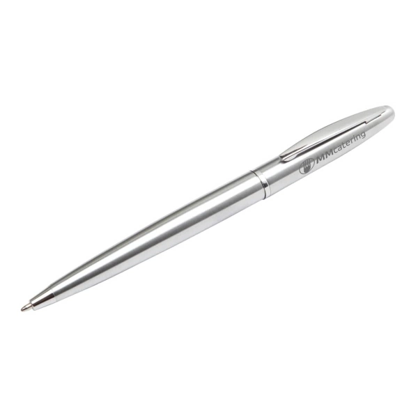A contemporary twist action pen with curved styling and upmarket brushed stainless steel finish.