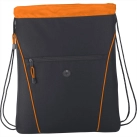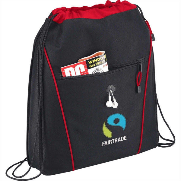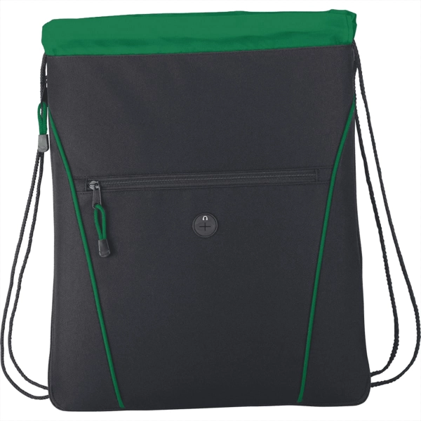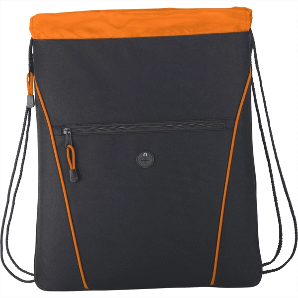 The Raven Drawstring Bag has an open main compartment with a cinching rope closure. It also features a zippered expandable gusset and a zippered front pocket with a convenient earbud port.