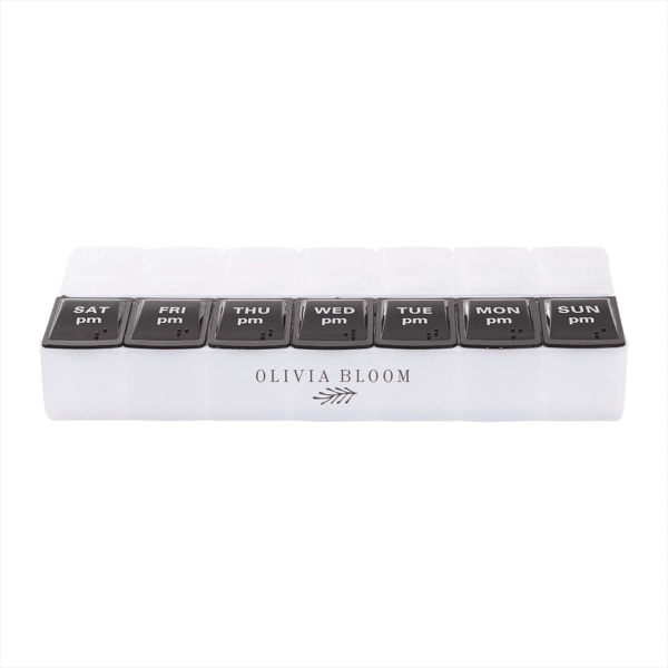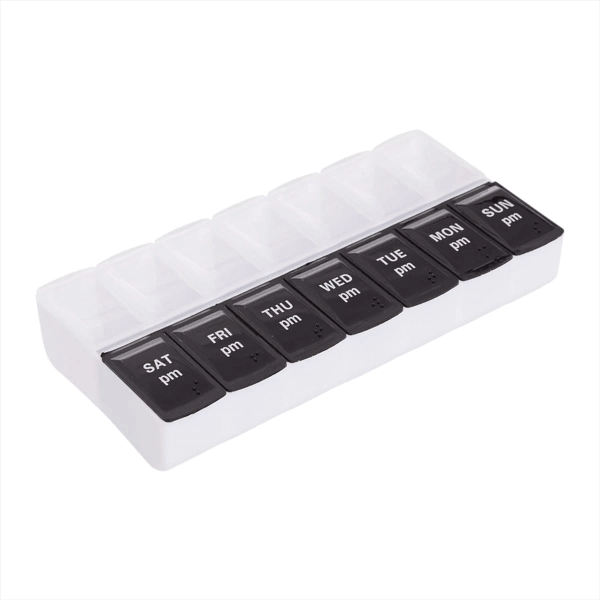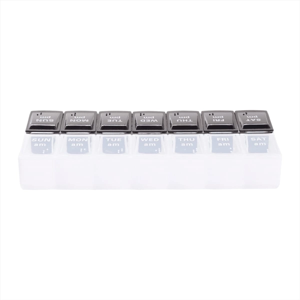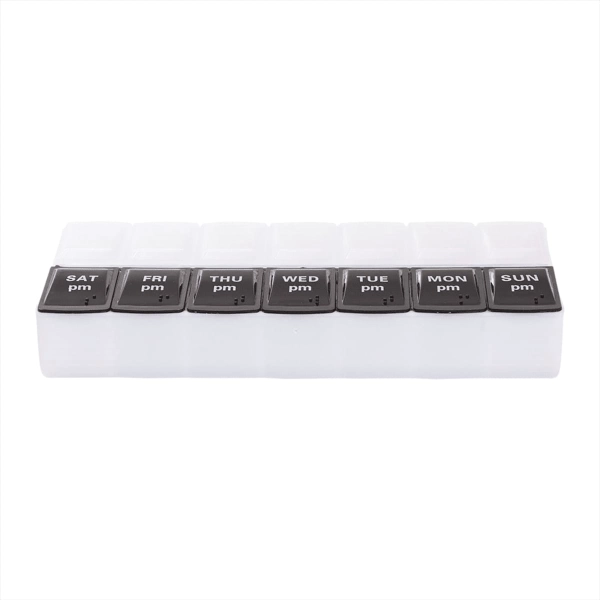 The 7-Day AM/PM Pill Case is an eco-friendly storage box with labelled compartments for daily doses. Material: Recycled PP - 14 labeled compartments for AM/PM doses - Convenient for medicine cabinet or nightstand