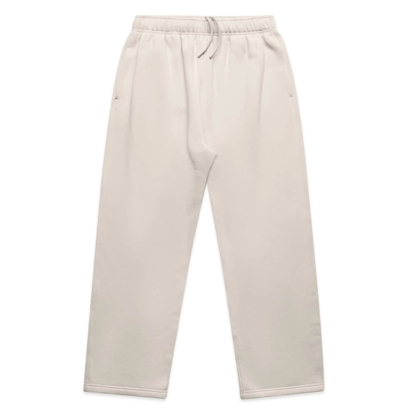 Relax cuffless trackpants in mid-weight 320 GSM fabric with 80% cotton and 20% recycled polyester. Features elastic waistband, tonal drawcord, two side pockets, and one back pocket.