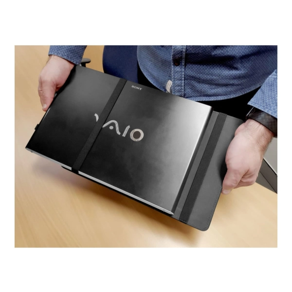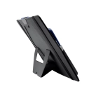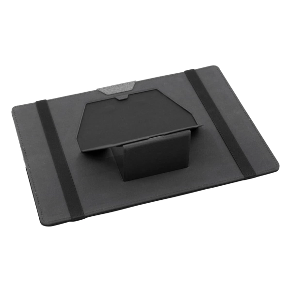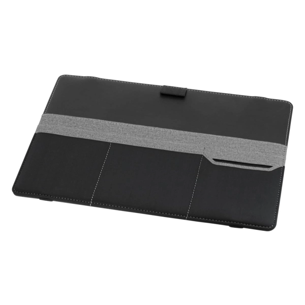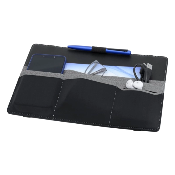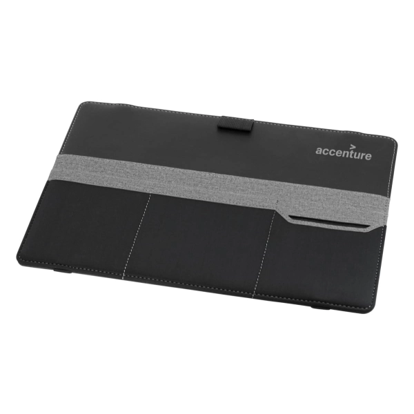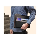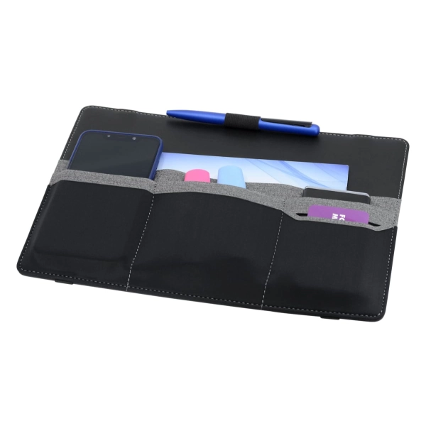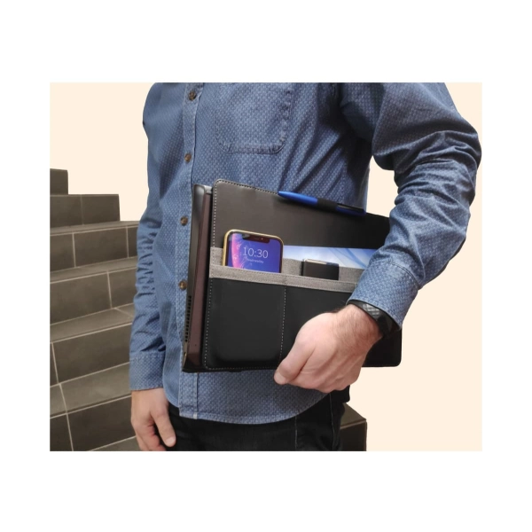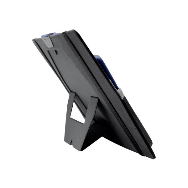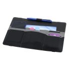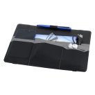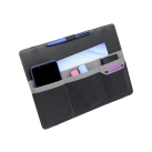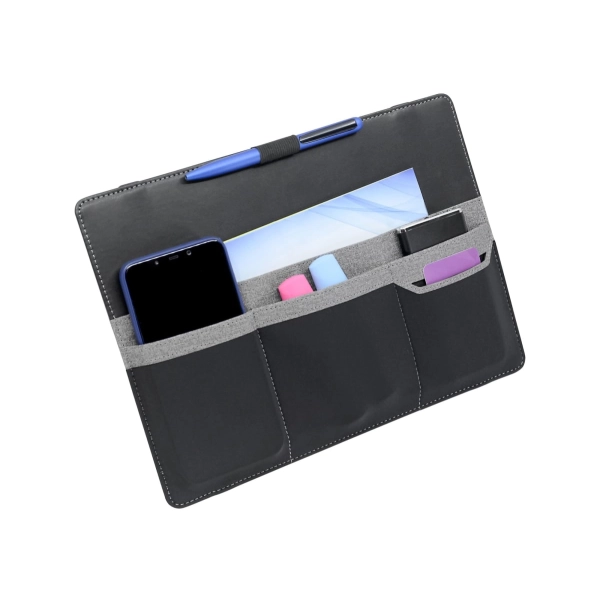 This organiser easily attaches to a laptop and is designed to keep all your stationery and tech products together for easy access. Standing upright, it features a fold-out leg, multiple pockets to hold a phone, cards, chargers, brochures and much more.