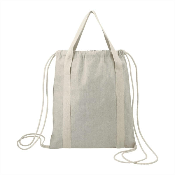 The Repose 5oz. Recycled Cotton Drawstring Bag is made from recycled pre-consumer cotton. It features a front slip pocket as well as an internal pocket for keeping your water bottle upright. Use the 5.5" drop handles or the shoulders straps for comfy carrying. Through a partnership with 1% For The Planet, one percent of sales of all EcoSmart® products are donated to environmental nonprofits.