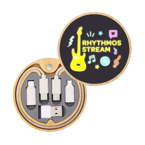 The Reveal Inductive Circle Charger Set is a sleek, all-in-one charging solution crafted from natural bamboo and wheat straw. Compact and functional, it’s the perfect size for your desk while still being portable enough for on-the-go use. Inside, you'll find a Type C to C 50cm cable, along with Type A, Micro USB, and iOS adapters to ensure wide device compatibility. These fast-charging adapters are securely held in place by a grey base insert for neat storage. The star feature? Built-in 15W Qi wireless charging for effortless, cable-free top-ups. Simply plug the unit into power using the included cable to activate the charging surface — perfect for keeping your phone charged throughout the day. For a premium touch, the smooth black acrylic panel on the lid is designed to showcase your brand. Your logo can be laser engraved or digitally printed and will illuminate when the unit is plugged in, offering a standout branding moment on any desk.