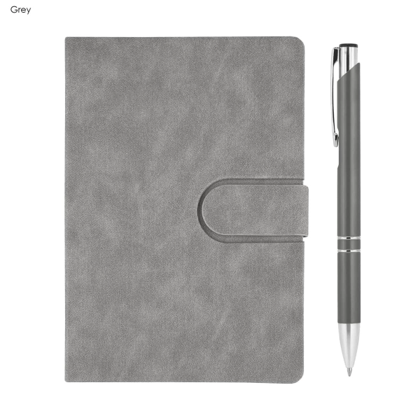This modern A5 notebook features a hard PU leather cover with magnetic flip closure, 160 pages of 80gsm lined off white paper, and a matching fabric bookmark. Paired with a stylish aluminium pen with a Parker Type German refill, both are presented in a durable black cardboard gift box, perfect for gifting.