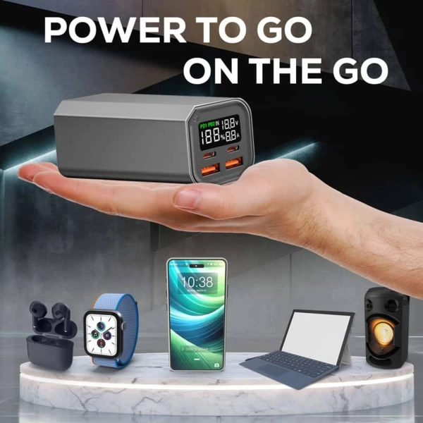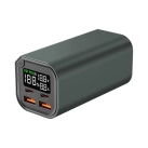 The Rocco 100W PD Fast Charging Power Bank is ideal for charging laptops, phones, headphones, and earbuds, especially during long travel days. This laptop power bank features dual Type-C input and output ports and dual Quick-Charge USB output ports. It also has a vibrant LCD digital display that shows battery power, voltage, and current levels. The capability to charge four devices simultaneously simplifies your charging setup and reduces the number of chargers you need to carry. Additionally, it is equipped with over-voltage, over-current, and short-circuit protection, ensuring your devices remain safe and secure. The package includes a Type-C charging cable and a user manual. Materials: Aluminum, ABS, PC.