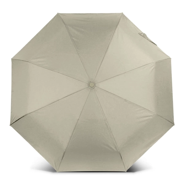 Compact 54cm, triple-folding umbrella with an eight-rib frame and automatic opening and closing. The eight-panel canopy is manufactured from 190T RPET (recycled PET) pongee, produced by recycling used water bottles and food packaging. It has 54cm fibreglass ribs and a steel shaft and folds down to a compact 28cm. It has a matching pongee sleeve and a Japanese oak wooden handle.