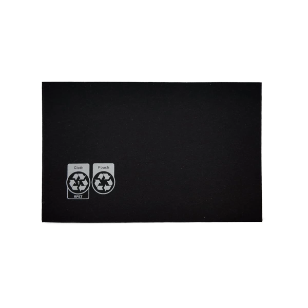 The RPET Zig Zag Microfibre Lens Cloth is an everyday essential designed to keep screens and lenses clean—while making a better choice for the planet. Made from RPET, a fabric created using recycled PET materials, it offers excellent oil and moisture absorption without compromising on performance. The cloth is fully customisable with vibrant, full colour branding on one side, giving your logo strong visibility on a practical, reusable item. Each cloth is presented in a recyclable black cardboard pouch, creating a neat and retail-style presentation. The back of the pouch highlights the sustainability of both the cloth and its packaging, reinforcing your brand’s environmentally responsible message.