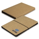 Modern A5 Portfolio, manufactured from cork with an elastic PU strap for secure closure. Other features include a lined paper pad, a pen holder, five business card slots, a pocket for notes and a slip side pocket for documents. When cork is harvested only the outer bark is removed from the tree. This allows the tree to continue growing and replenishing the bark. It also has the benefit of a comfortable soft-touch texture while being very durable. The portfolio is presented in an unbleached kraft cardboard sleeve.
