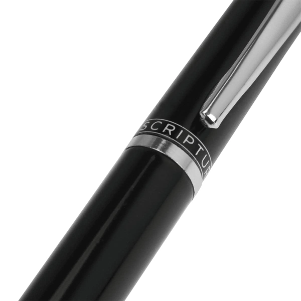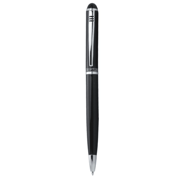 Exclusively designed twist type ballpoint pen. The silver has a matte finish, the black a gloss
