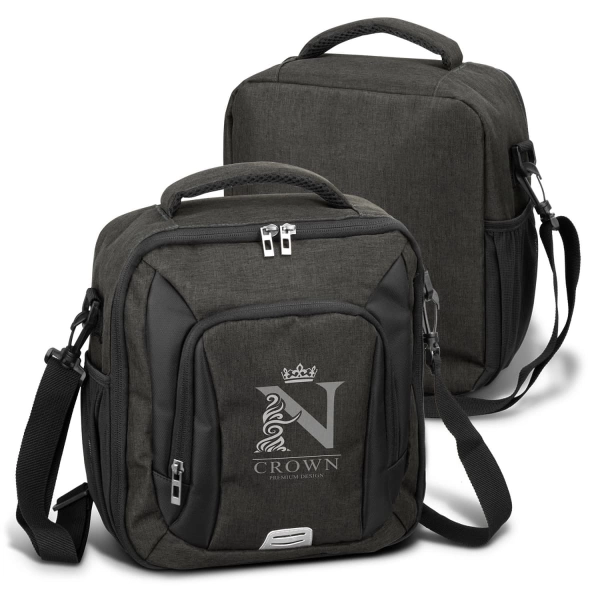 Smart 8L cooler bag which is manufactured from 300D polyester with a grey inner lining insulation. It has a zippered front closure, a woven carry handle, an adjustable woven shoulder strap, one zippered external pocket with a stunning blue inner lining that features five elastic loops to secure your picnic essentials and one mesh pocket.