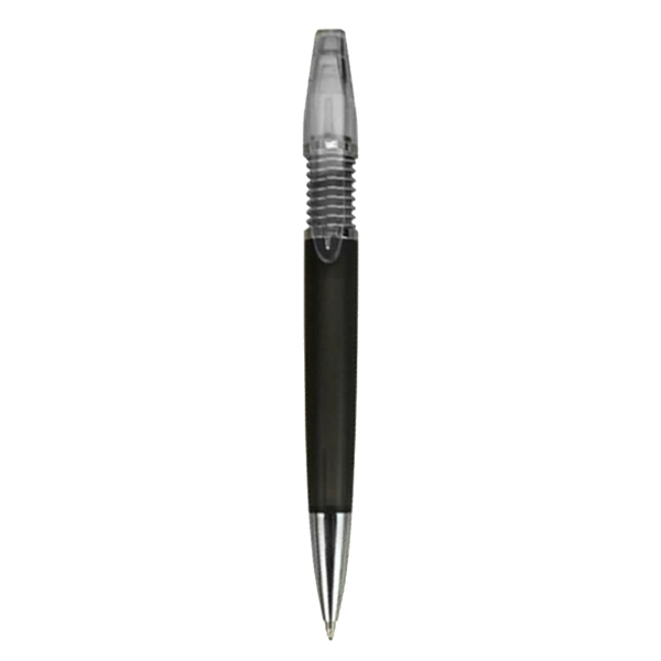 A plastic pen with a unique sprung click action frost translucent coloured body with shiny silver chrome fittings high quality German manufactured black ink refill 1800 meters writing distance tungsten carbide ball provides you with quality writing.