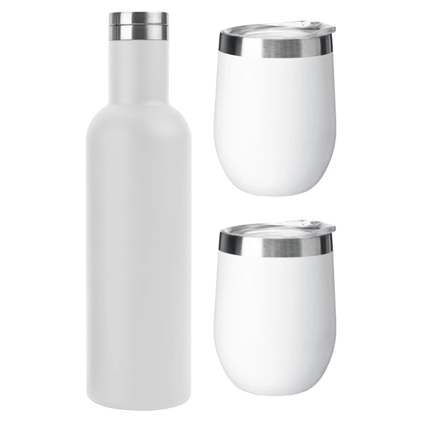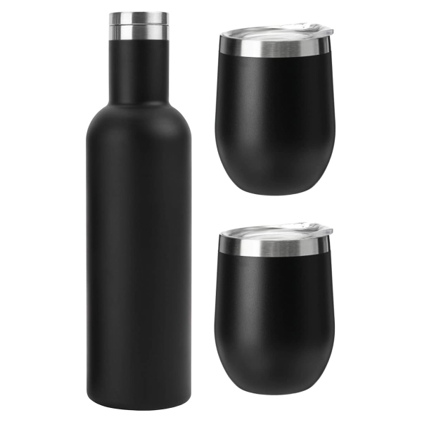 A great BPA free vacuum insulated double wall 730ml stainless steel Shiraz Drink Bottle in a unique wine bottle design makes the best addition to any picnic or party and 2 x 350ml (two standard glasses of wine) 304 grade stainless steel egg shape wine and coffee cup with a BPA free push-seal plastic lid. Powder coated matt finishing exterior and electrolysis interior all packed into a smooth semi-gloss black cardboard box with a die-cut foam base to hold bottle and mugs.