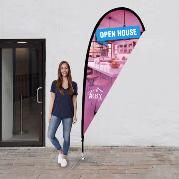 Draw attention to your event or business with an eye-catching tear drop flag. The kit includes a high-quality knitted polyester tear drop flag that measures 191cm x 60cm, and a carry bag. Depending on your needs you can choose from spike, cross, square, wheel, wall mounted and floor mounted bases. A water bag weight is also available as an additional accessory. This product is branded via sublimation print and has a lead time of 14 working days.