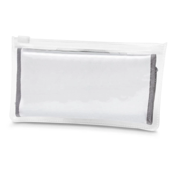 Thick dual action microfibre screen cleaning cloth which can be washed and reused many times. It is presented in a clear storage pouch and can be used with or without screen cleaning fluid. The Smart Screen Cleaner is ideal for cleaning all screens from the smallest phone to the largest television and is also great for eyeglasses and car dashboards etc. The textured grey reverse side is for general cleaning and the smoother branded side will polish screens like new. It can be branded in spot colours or full colour and the edges are overlocked in grey. A production lead time of 25 working days applies to this product by air freight and larger orders can be sea freighted on request to reduce the freight cost.