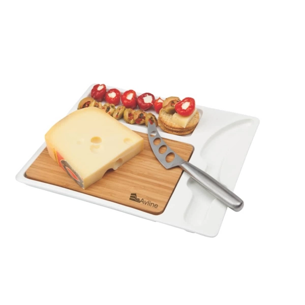 Combining ‘eco-friendly’ bamboo with stylish ceramic, Snack-Rack will be used around the office and at home. Large enough to fit cheese, crackers and all those tasty snacks, the perfect item for your logo. Supplied with a stainless steel knife. Because of the unique nature of bamboo, the product and engraving colour may vary from item to item. As this product is hand crafted, each Cheese Board may differ slightly in shape and size.