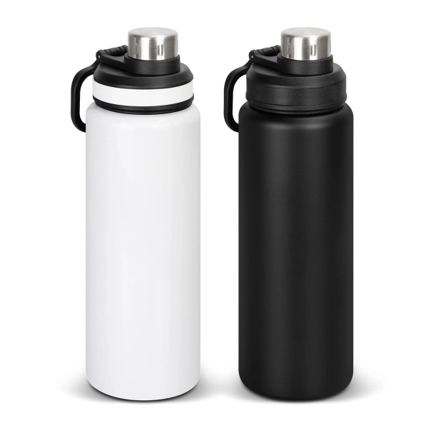 The perfect drinking companion, this 900ml single wall drink bottle is made from stainless steel and comes with a secure screw on lid featuring a silicone band for extra grip. This water bottle comes in a sleek matte black or a white high gloss paint finish, along with a convenient carry handle. this bottle is the perfect blend of style and practicality, and is presented in a natural gift box. This product is not dishwasher safe, and handwashing is recommended.