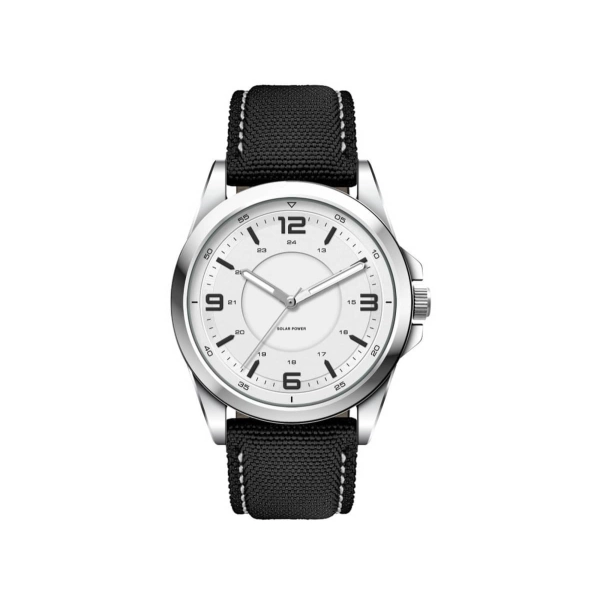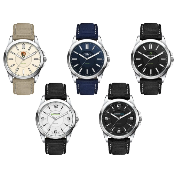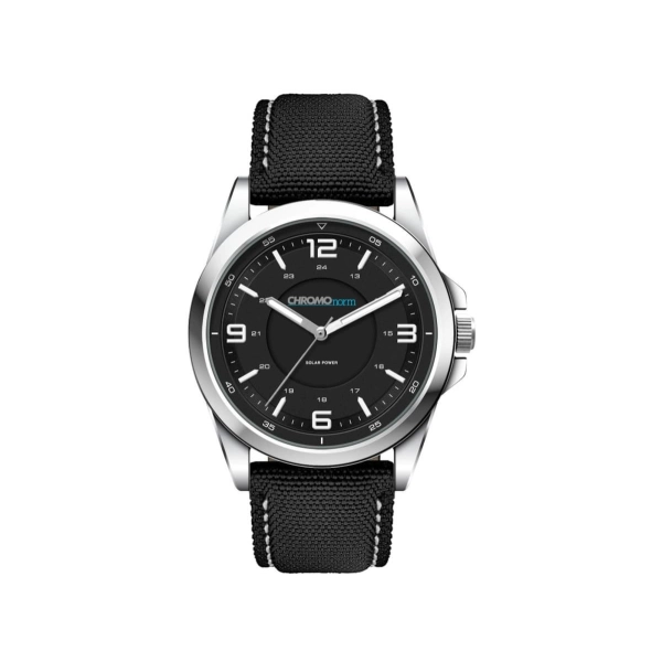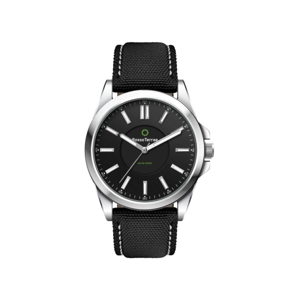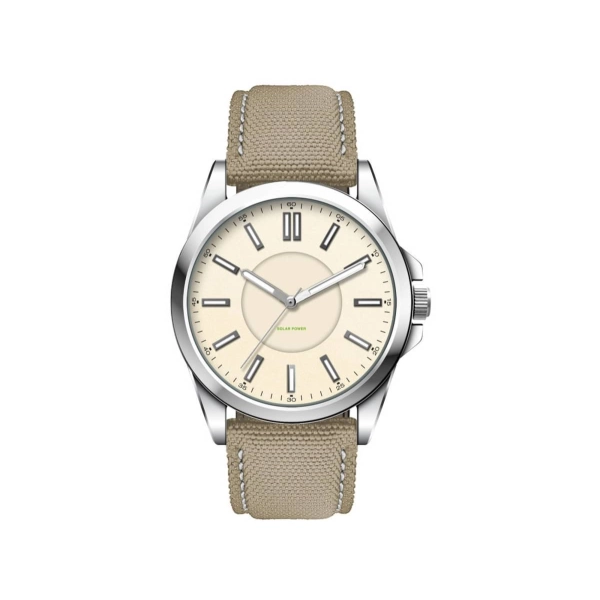 This eco-friendly solar charging unisex watch features an Ionic steel plated alloy case and is water resistant to 3 atm’s. Available with black, beige, blue or white dial. In line with the eco-friendly solar charging, this watch is available with the choice of black, blue or beige rPET nylon straps, all with white stitching.