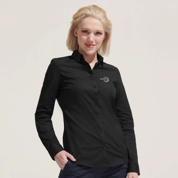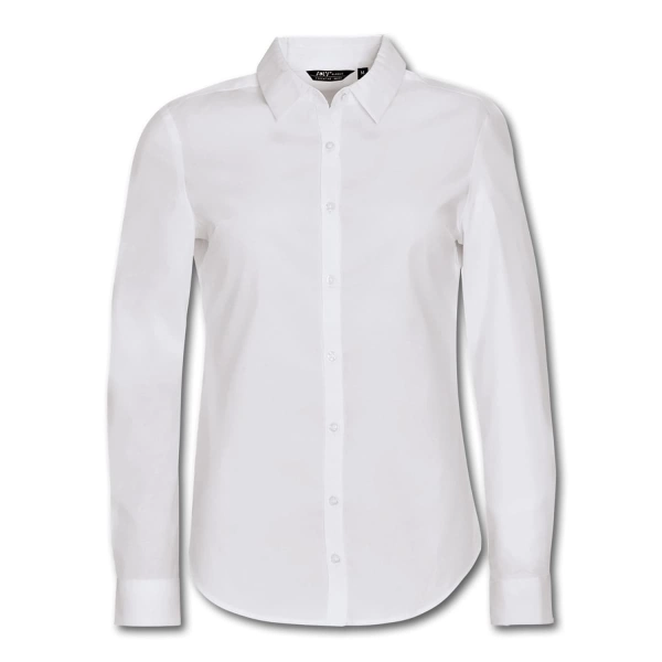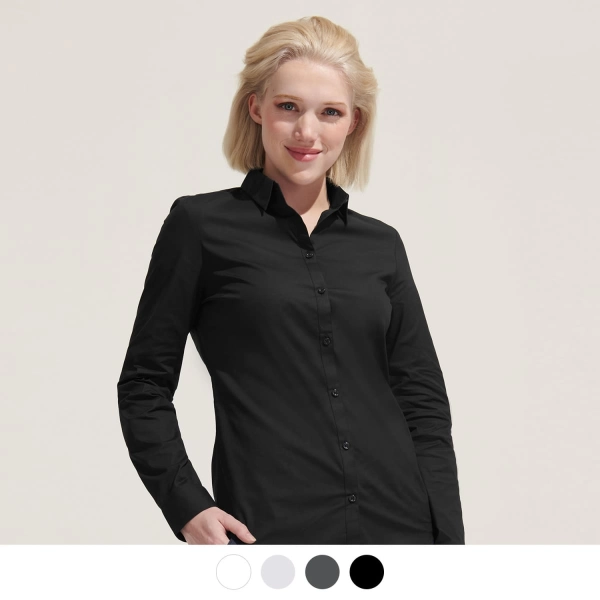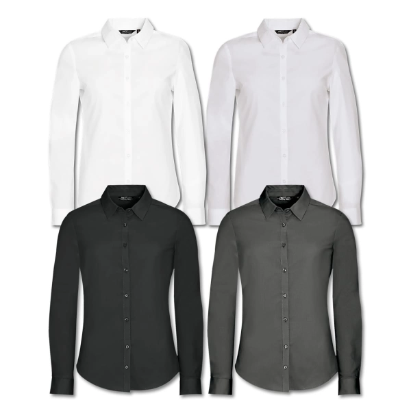 Smart and fashion-forward, the Blake women's Shirt is manufactured from a blend of 120gsm cotton and elastane, making this shirt well-suited for retail and hospitality workplaces. This shirt features long sleeves with rounded single-button cuffs, an eight-button placket, a classic collar and darts on the front and back of the shirt for a stylish fit. This shirt is a European fit and is available in seven sizes. Washing it with similar colours before first use is recommended.