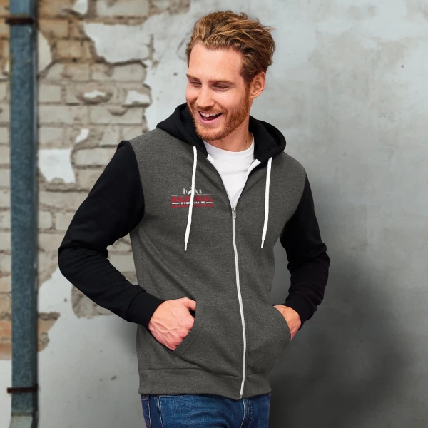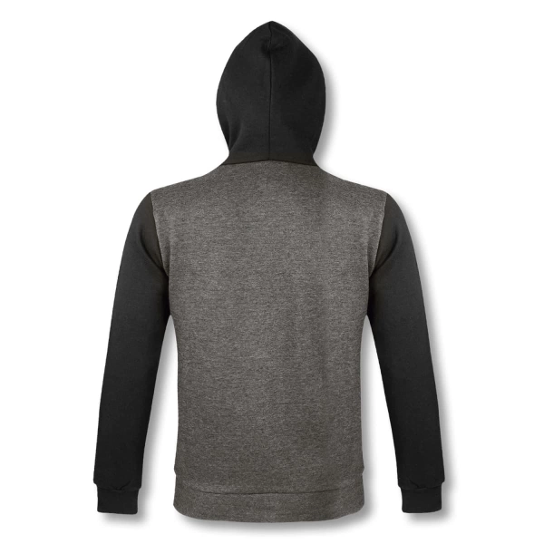 Contrasting 280gsm, unisex adult sweatshirt with a full zippered front and a brushed fleece lining for added comfort and warmth. It is manufactured from an 50/50 blend of ring-spun cotton and polyester with ribbed elastane on the hem and cuffs. Other features include set in sleeves, two kangaroo pockets on the front and a hood with a contrasting white drawstring. The Silver sweatshirt is cut and sewn with a fitted design. It is available in six sizes and provides an excellent branding opportunity that will appeal to a broad market.