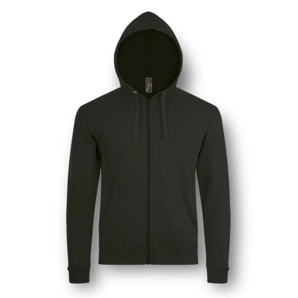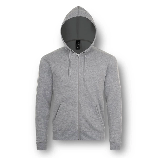 Stylish 260gsm, unisex adult sweatshirt with a full zippered front. It is manufactured from a 50/50 blend of ring-spun cotton and polyester with ribbed elastane on the hem and cuffs. Other features include set in sleeves, two kangaroo pockets on the front and a hood with a tone-on-tone drawstring. Stone has a straight cut design and a brushed fleece lining that gives it a soft and cosy feel while adding extra warmth. The garment is cut and sewn with a European fit and is available in seven sizes. It provides an excellent branding opportunity that will appeal to a broad market.