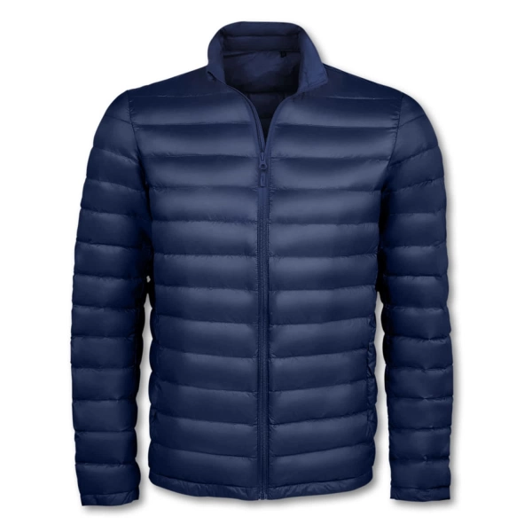 Lightweight men's 380T, long sleeve puffer jacket with a polyamide outer and lining, and a blend of 100% recycled polyester padding for extra warmth. The jacket has a full zippered front which extends to include the high collar, two large, zippered side pockets which double as hand warmers, and two internal pockets. Wilson is a European fit and is available in six sizes. An in-bag folding system with stoppers is included for convenient storage.