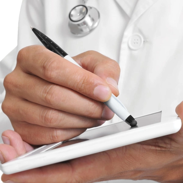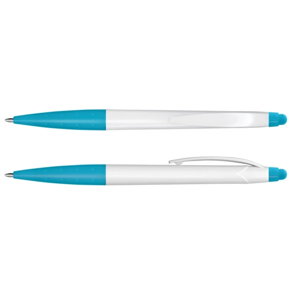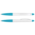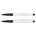 Twist-action plastic ballpoint pen with a white barrel and a stylus. The pen has a black refill with 500 metres of writing ink and can be presented in an optional pen sleeve.