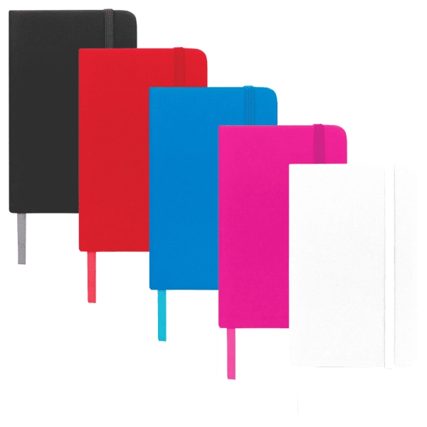 Pocket notebook with matching colour elastic closure and ribbon. Available in 5 colours