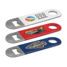 Small stainless steel bottle opener with a soft-touch vinyl coating.