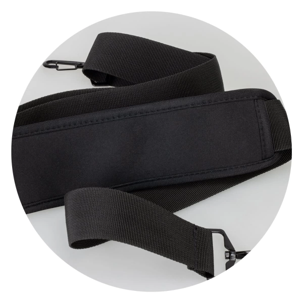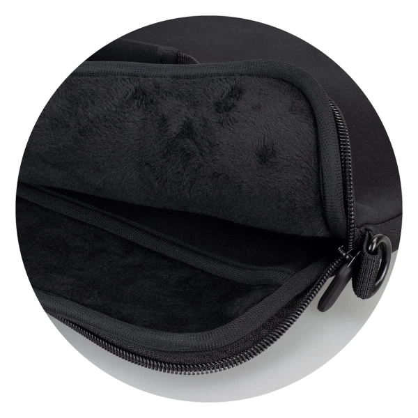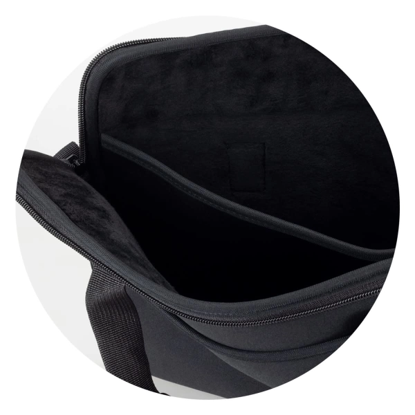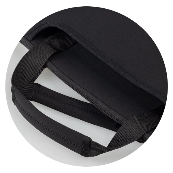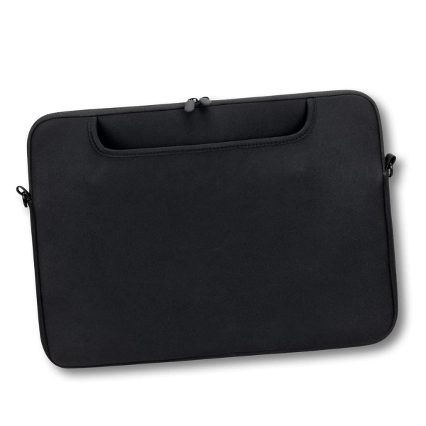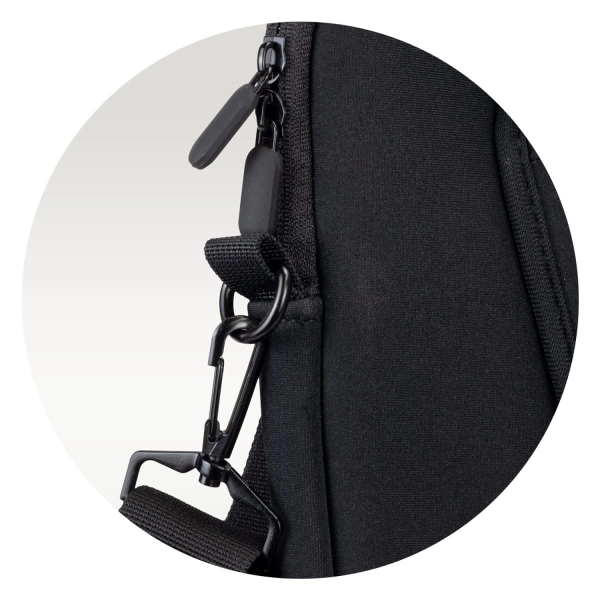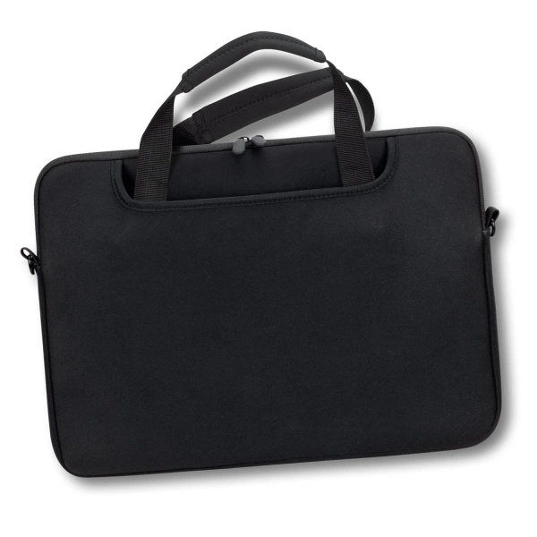 Secure neoprene laptop bag with stowaway carry handles and a removable shoulder strap, meaning the bag can also be used as a laptop carry sleeve. The bag features a plush lining for added cushioning and a pocket divider to accommodate devices of various sizes. Using neoprene in the bag's construction provides extra protection and water resistance.