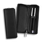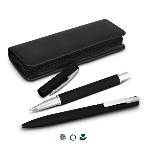 This premium SPICE pen gift set includes the SPICE Lyd rollerball pen and SPICE Lyd ballpoint pen. Made from recycled stainless steel, both feature rubberised barrels for a soft-touch, comfortable writing experience, and 1500m of high-quality black Dokumental ink. Designed for longevity and 100% carbon neutral to delivery, the pens are beautifully presented in a deluxe leather-look PU pen case. Perfect for corporate gifting.