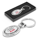 Oval metal key ring with a plated shiny chrome finish and an inner part that spins. The inner spinning part is branded on both sides with a resin coated finish and it is nicely presented in a black gift box.