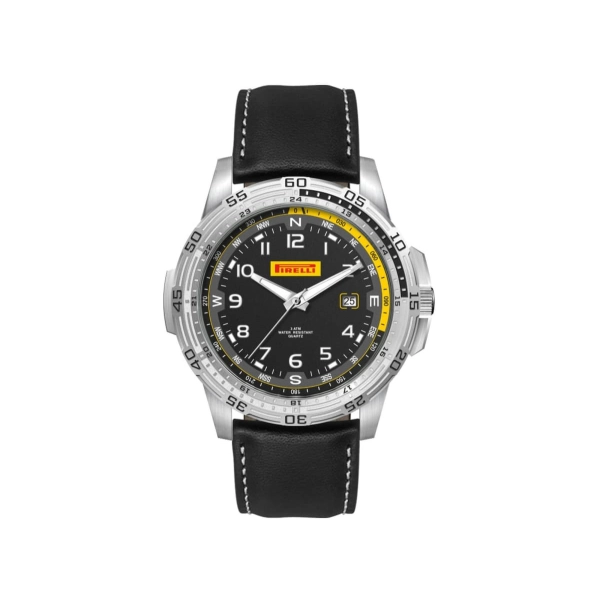 This quality sports watch features an Ionic steel plated alloy case, matt black dial, padded black natural leather strap with white stitching, fixed bezel, date function and is water resistant to 3 atm’s.