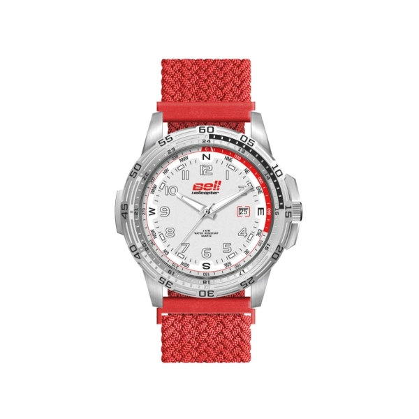 This quality sports watch features an Ionic steel plated alloy case, matt silver dial, red elastic nylon strap, fixed bezel, date function and is water resistant to 3 atm’s.