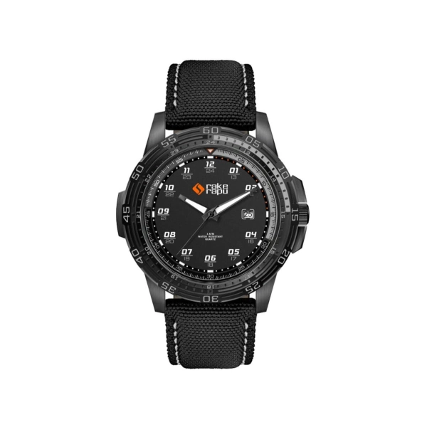 This quality sports watch features an Ionic black plated alloy case, matt black dial, padded black rPET strap with white stitching, fixed bezel, date function and is water resistant to 3 atm’s.